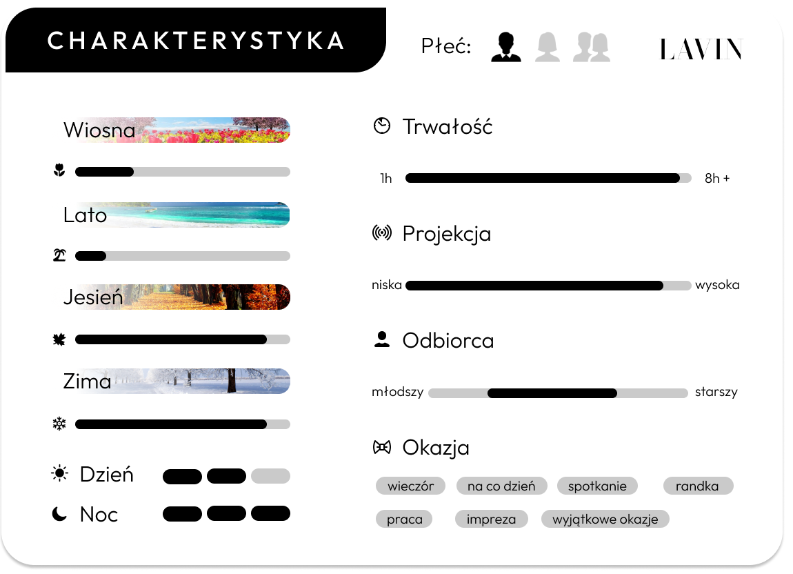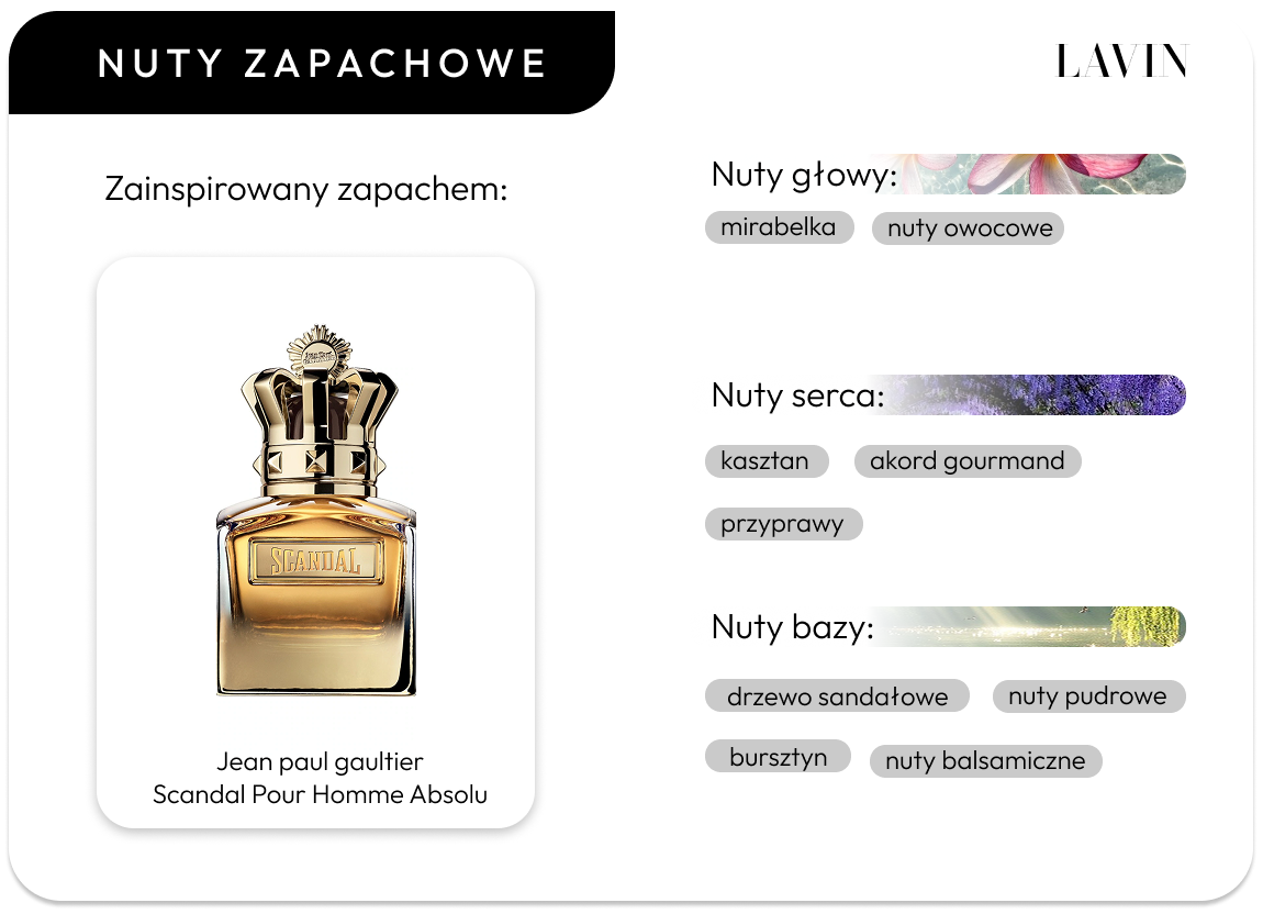 Nuty bazy: drzewo sandałowe, bursztyn, nuty pudrowe, nuty balsamiczne